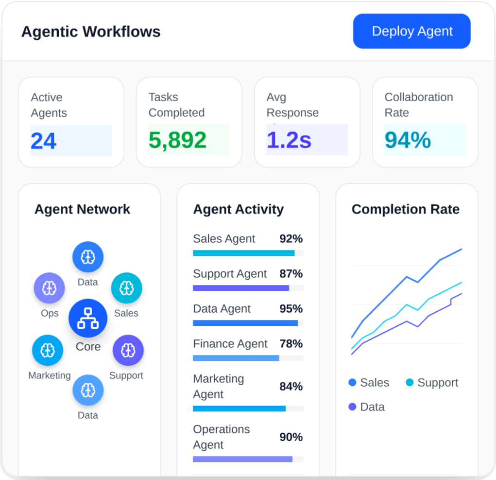 Разверните агентов ИИ, которые думают, принимают решения и действуют независимо. Создавайте сложные мультиагентные системы, которые взаимодействуют между отделами, оптимизируют процессы в режиме реального времени и адаптируются к изменяющимся условиям работы компании без ручного вмешательства.
